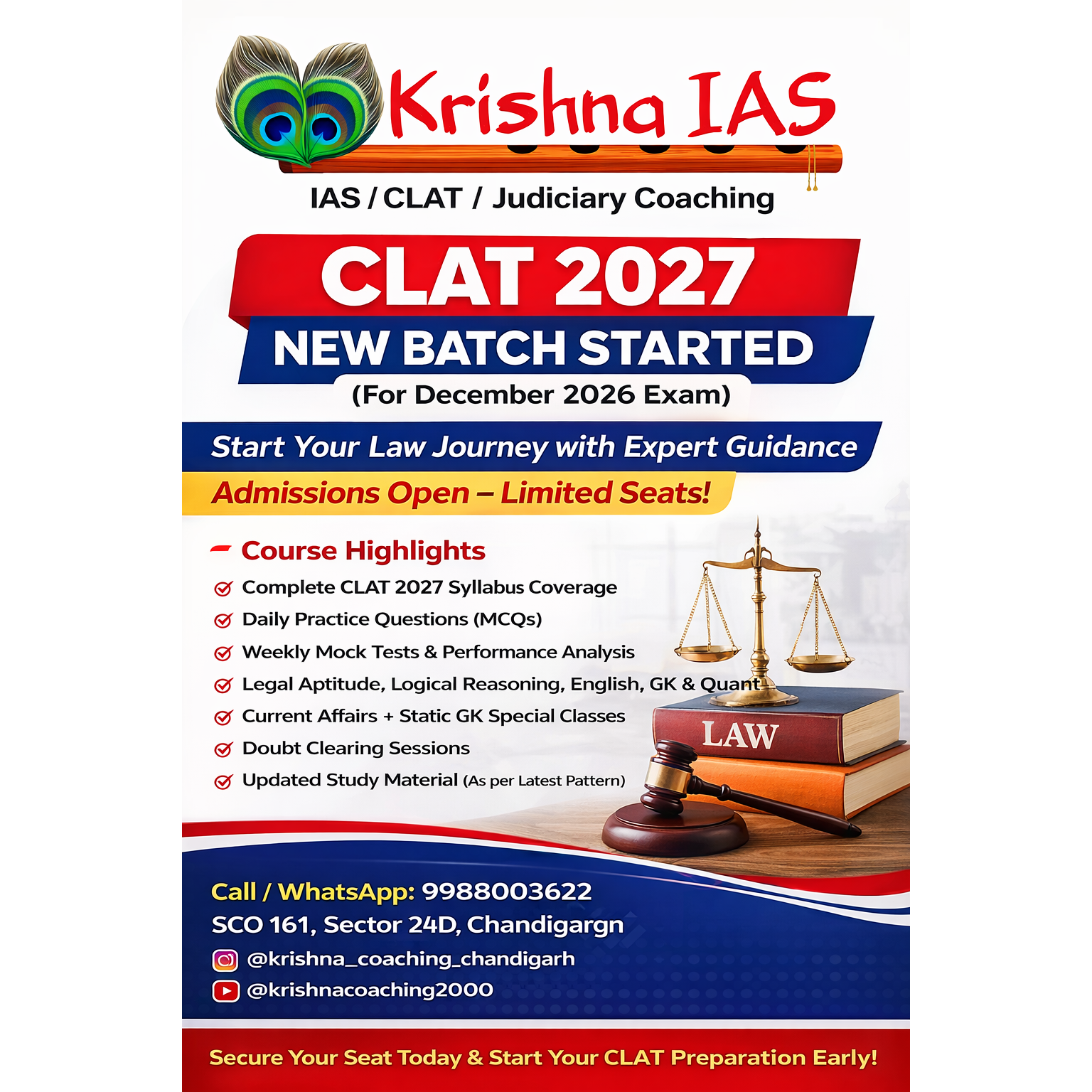 CLAT 2027 New Batch Started (For Dec 2026 Exam) Start your Law Journey with expert guidance and structured preparation! Admissions Open – Limited Seats! What You Get: Complete CLAT 2027 Syllabus Coverage Daily Practice Questions (MCQs) Weekly Mock Tests & Performance Analysis Legal Aptitude | Logical Reasoning | English | GK | Quant Current Affairs + Static GK Classes Doubt Clearing Sessions Updated Study Material (Latest Pattern) Why Choose Us? ✔ Experienced Faculty ✔ Personalized Mentorship ✔ Small Batch Size ✔ Online + Offline Classes Krishna IAS / CLAT Coaching, Chandigarh Call/WhatsApp: 9988003622 Secure Your Seat Today & Start Early Preparation! CLAT Coaching in Chandigarh Best CLAT Coaching Institute Chandigarh CLAT Classes Chandigarh Law Entrance Coaching Chandigarh Top CLAT Coaching Near Me CLAT Preparation Institute Chandigarh