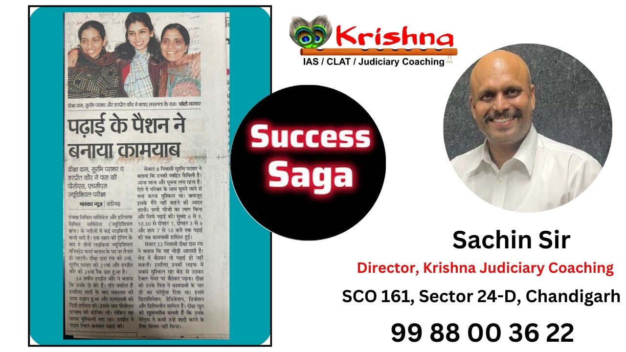Krishna Judiciary Coaching is one of the prominent institutes in Chandigarh for judiciary preparation. They offer comprehensive courses tailored for judicial services exams, including PCS(J) and other state judiciary exams. Known for experienced faculty and a structured curriculum, the institute has a reputation for producing successful candidates. Expert Faculty: Includes experienced legal professionals like Dr. Sachin Goyal, the Director, who is known for his mentorship and guidance. Personalized Attention: Small batch sizes to ensure better student-teacher interaction. Updated Study Material: Covers all aspects of the syllabus with recent amendments and case laws. Mock Tests & Feedback: Regular tests to assess performance and detailed feedback for improvement. Krishna Judiciary Coaching SCO 161, Sector 24-D, Chandigarh 99 88 00 36 22